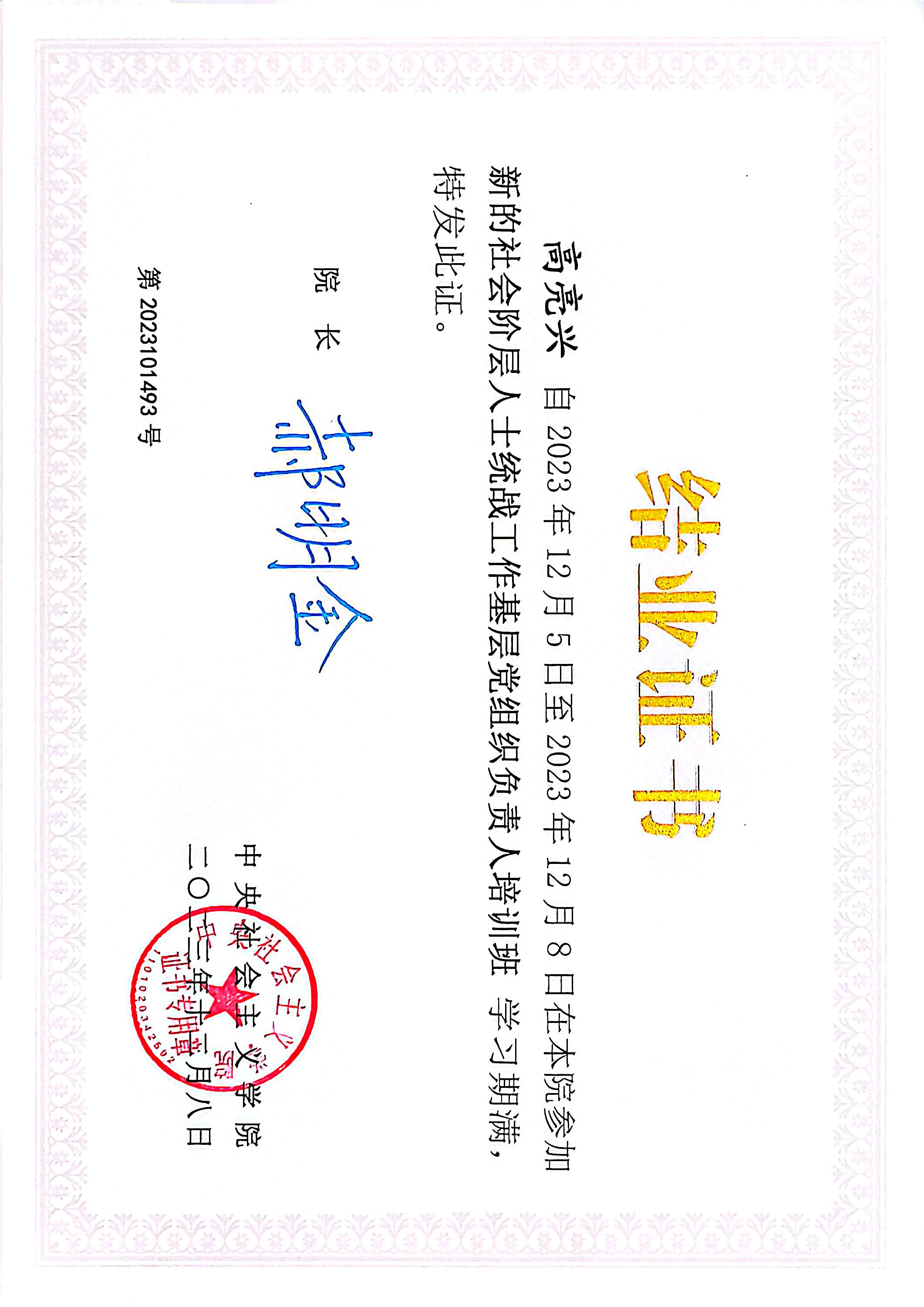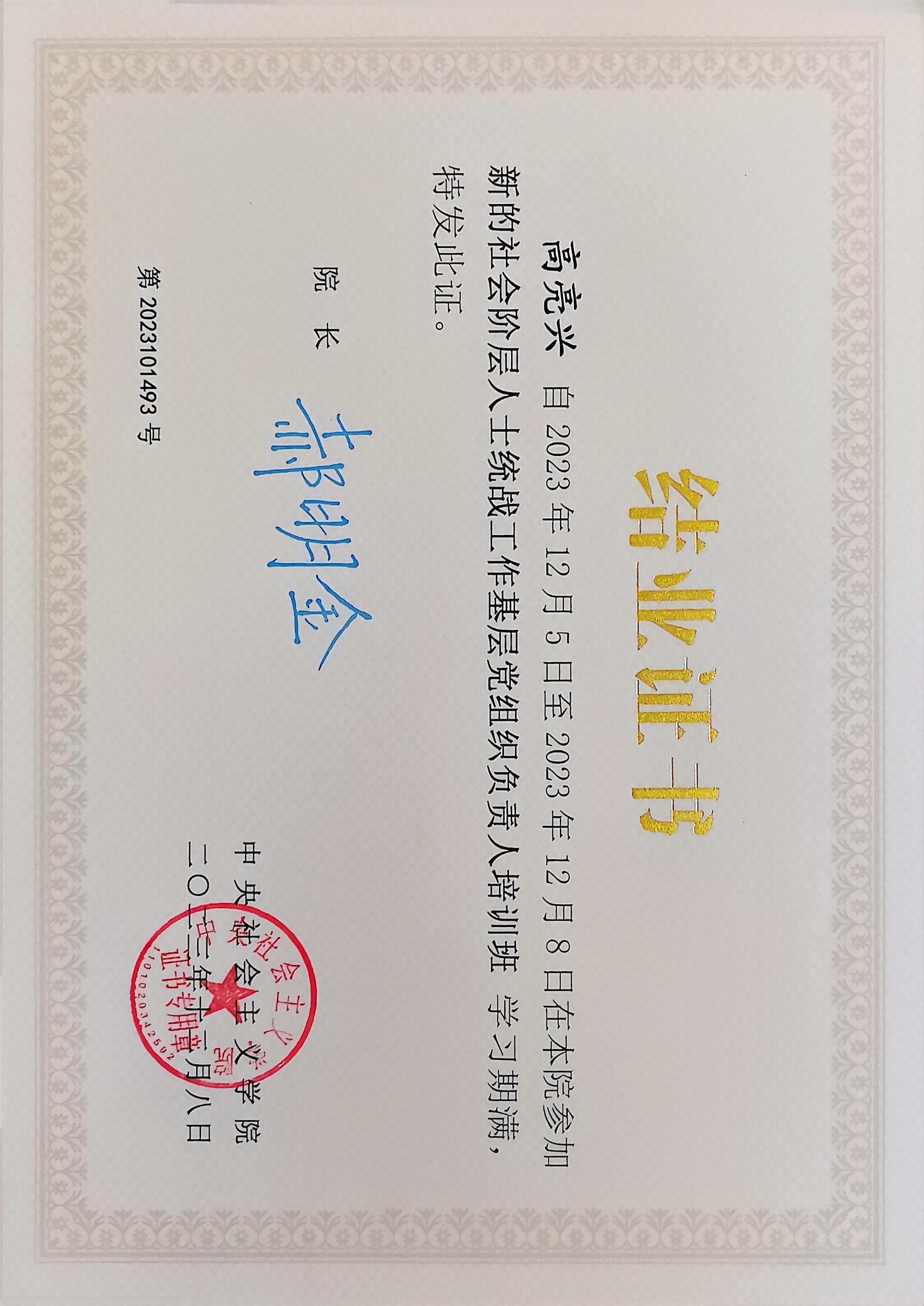 2023年12月5日参加中央社会主义学院“新的社会阶层人士统战工作基层党组织负责人培训班”学习。