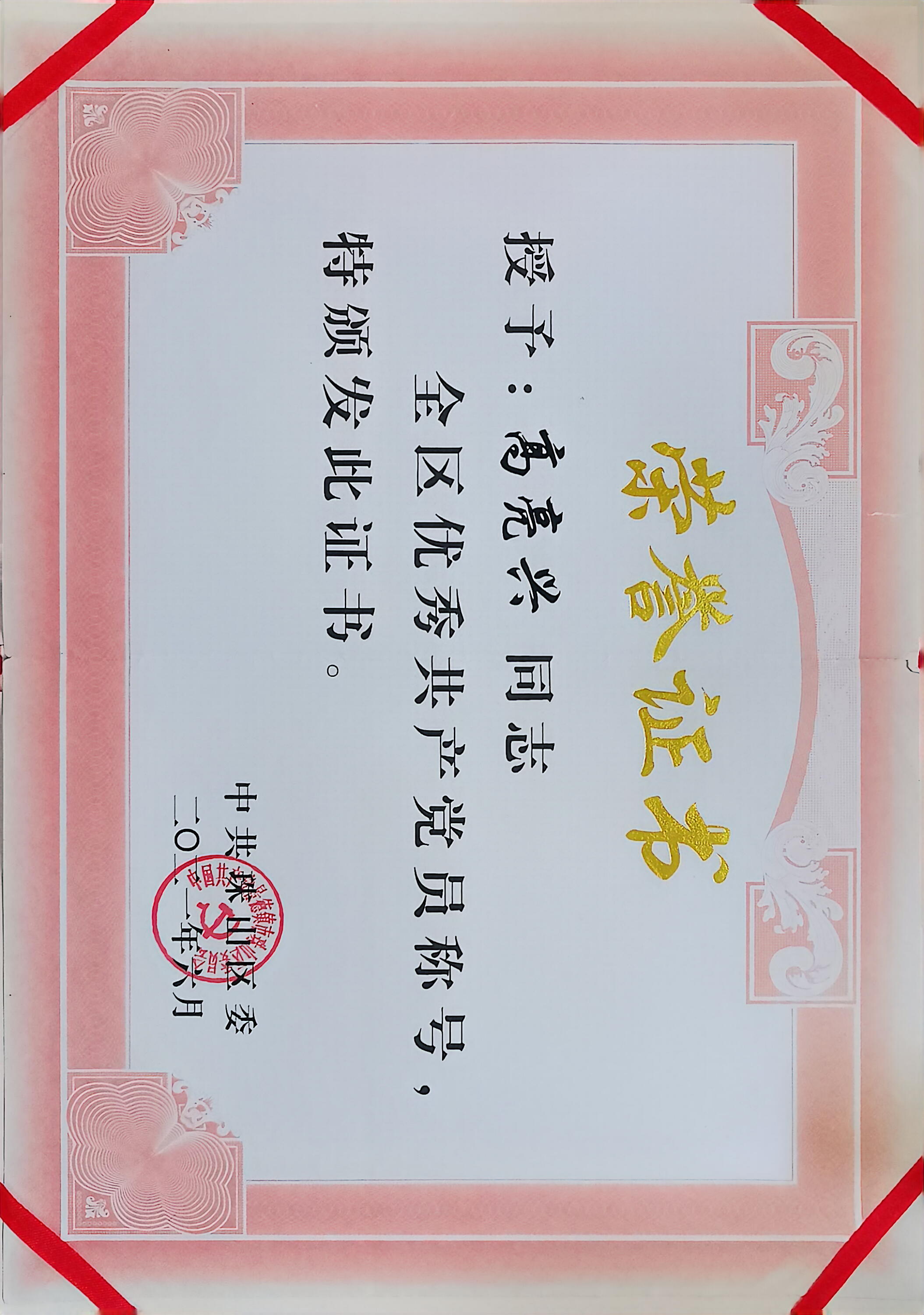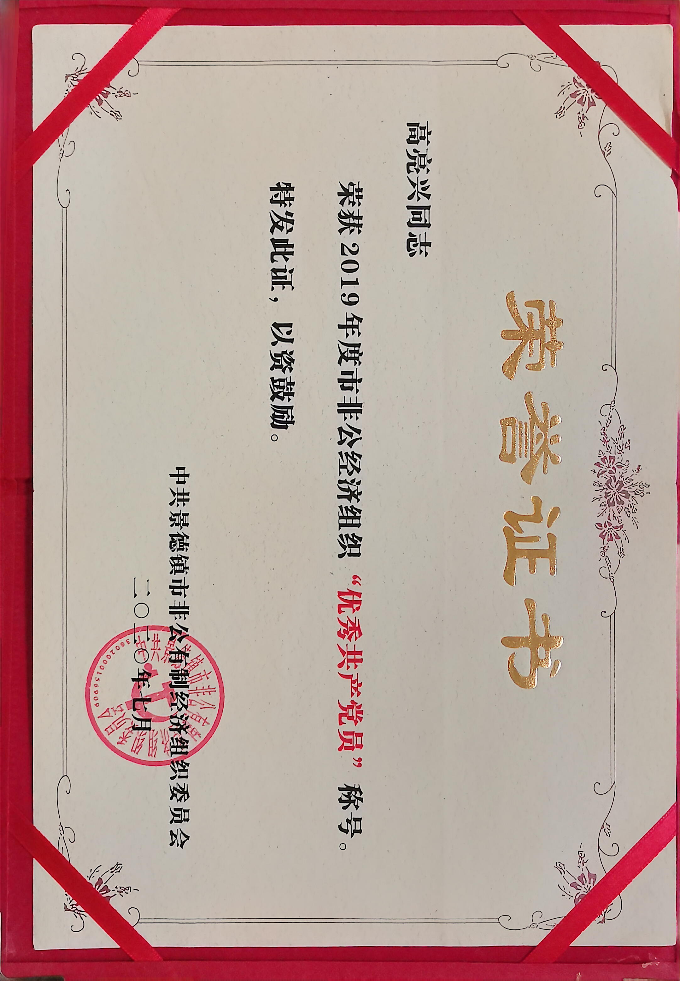 2020年7月1日荣获景德镇市非公有经济组织“优秀共产党员”称号。