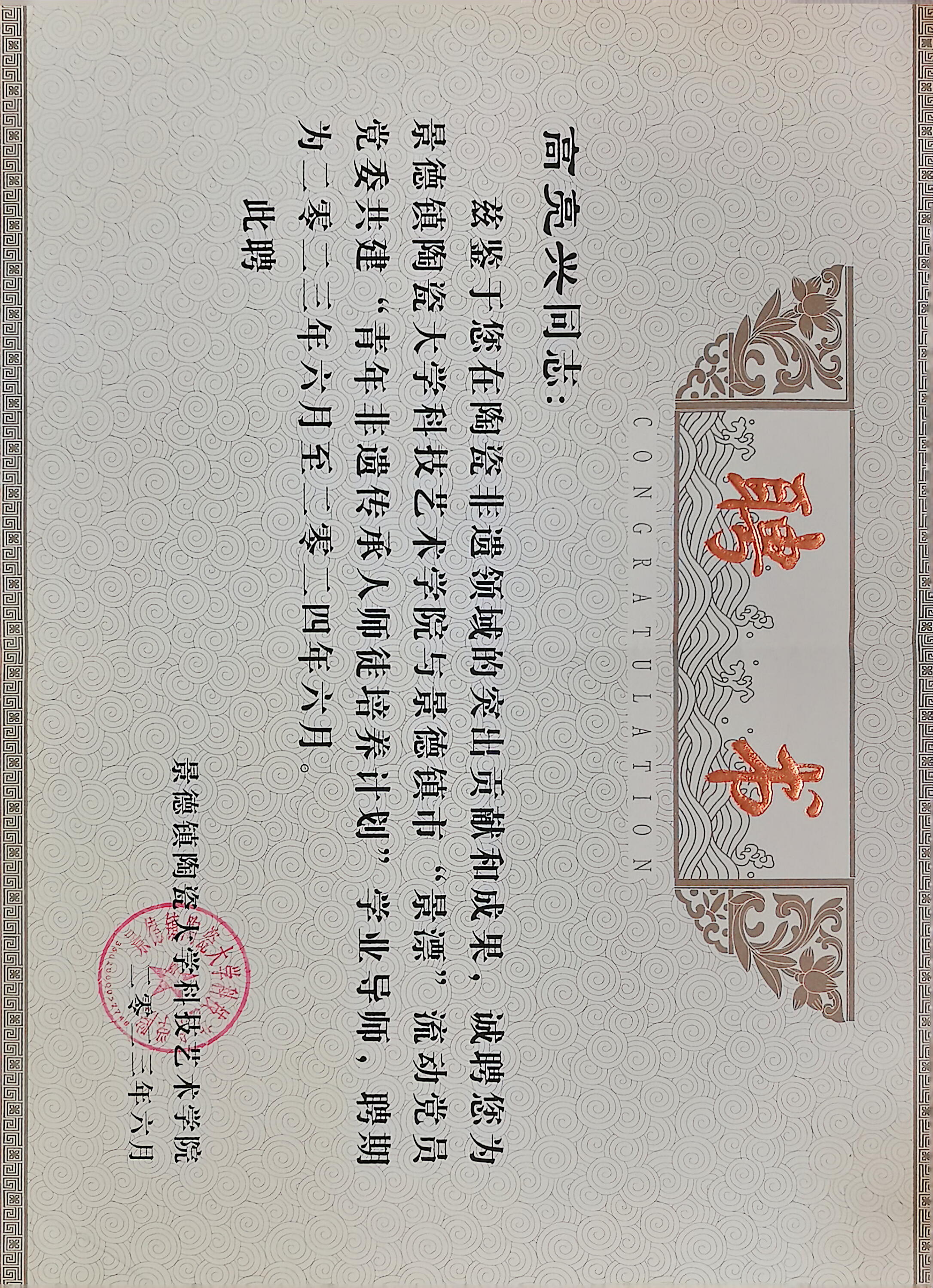 2013年获得景德镇高级陶瓷美术师。