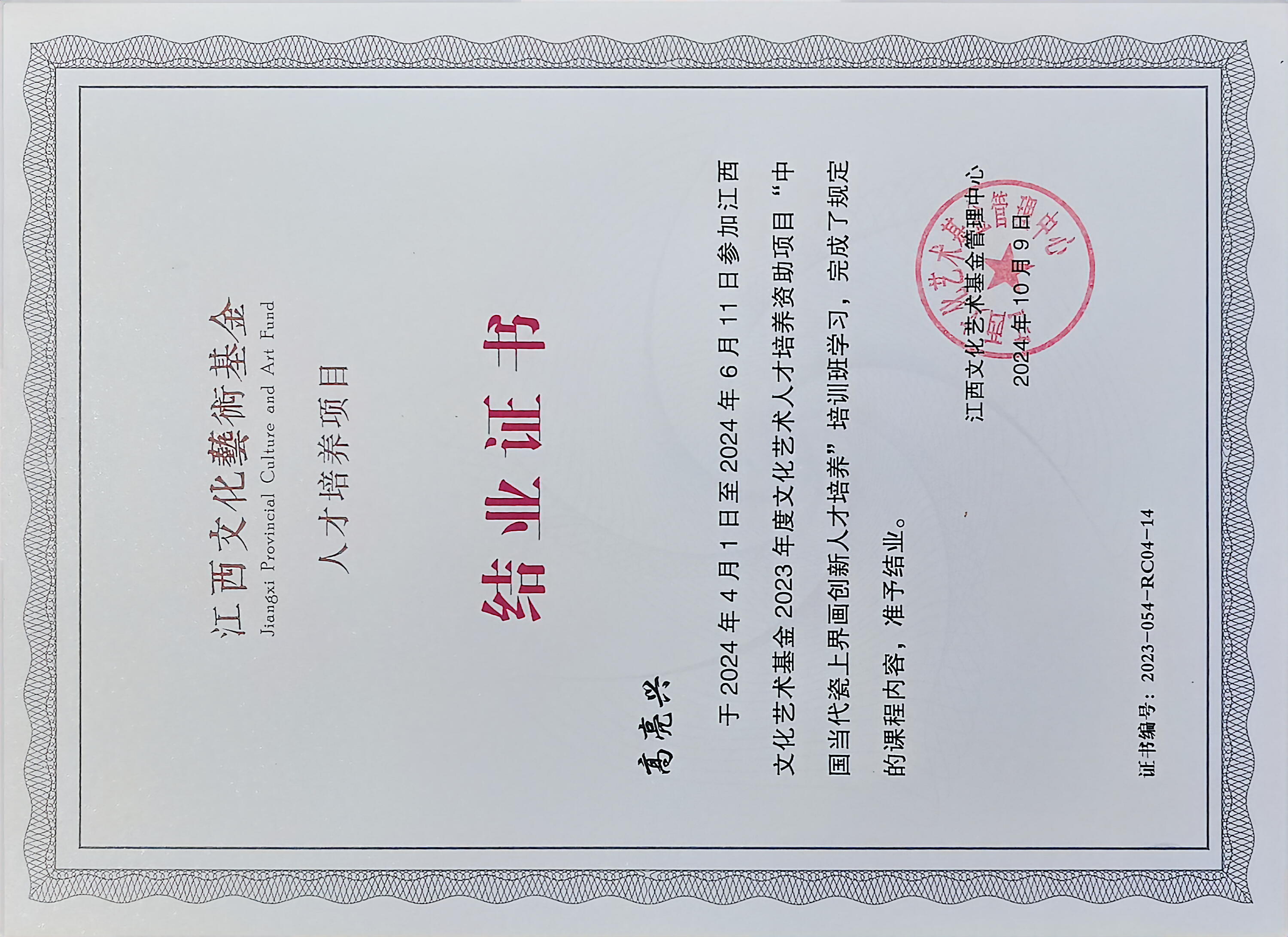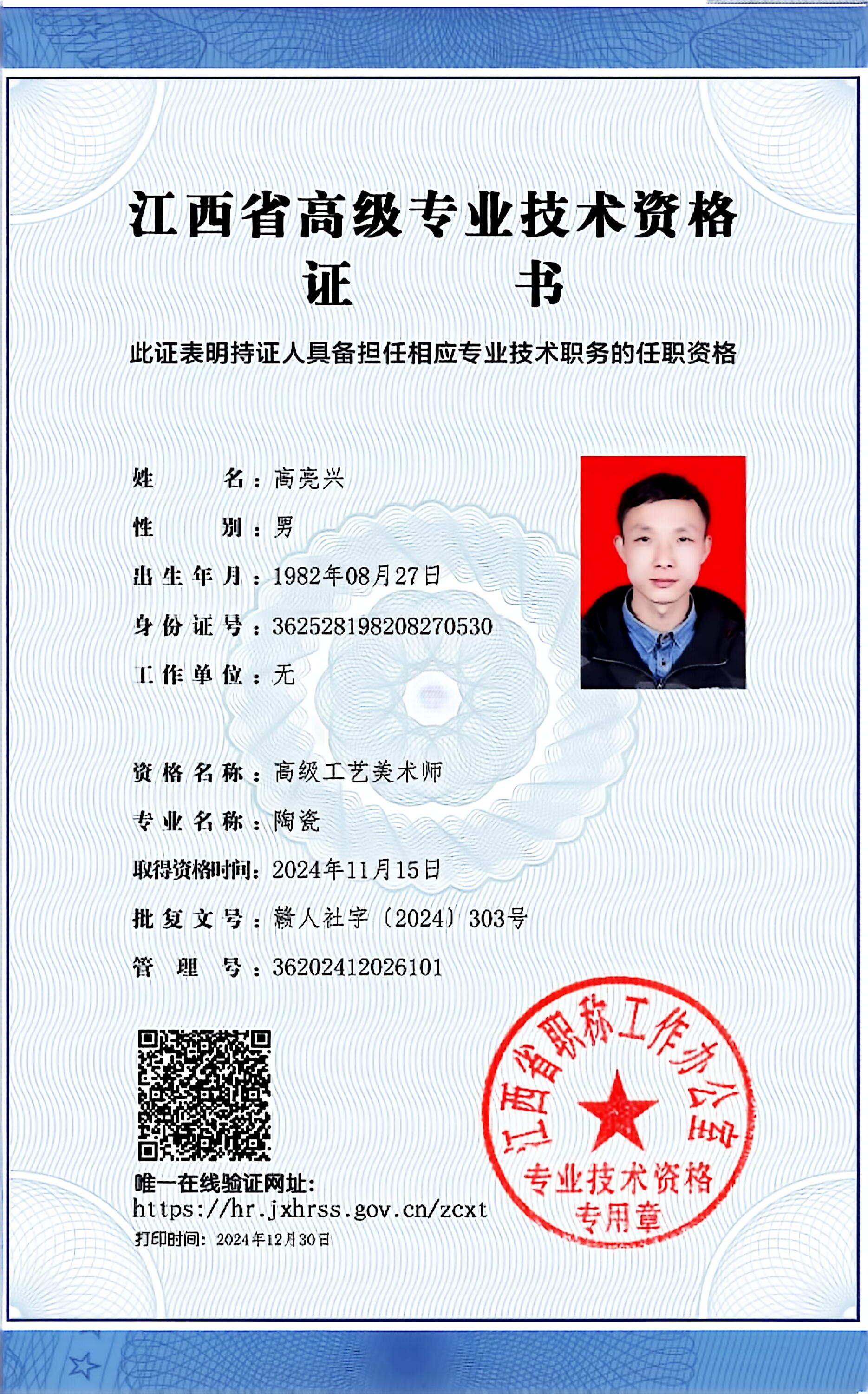2024年获得江西省高级工艺美术师(副教授级)。
