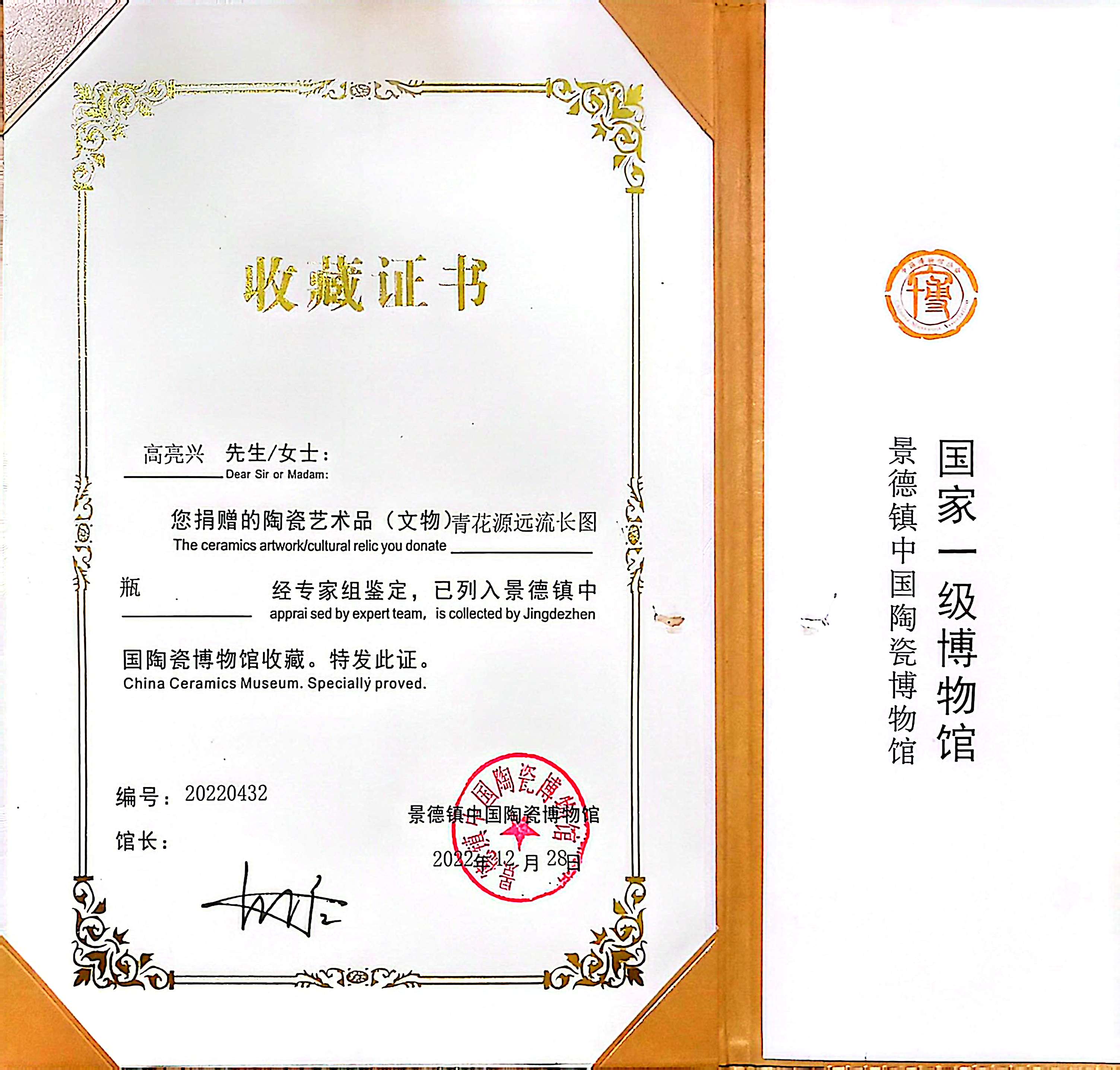 2022年12月作品青花瓷瓶《源远流长》经专家组鉴定,已列入景德镇中国陶瓷博物馆收藏。