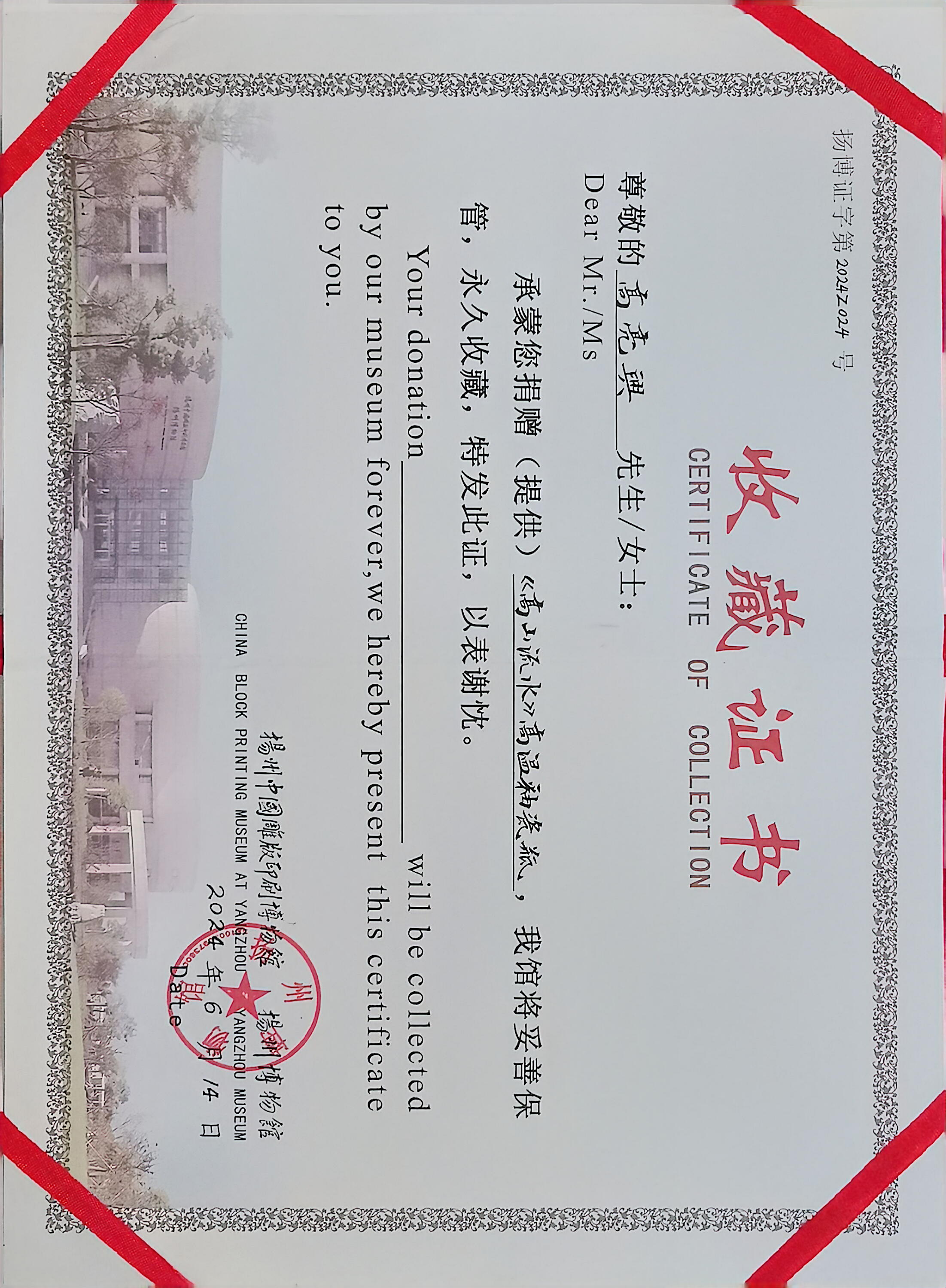 2024年作品《高山流水》列入扬州博物馆永久收藏。