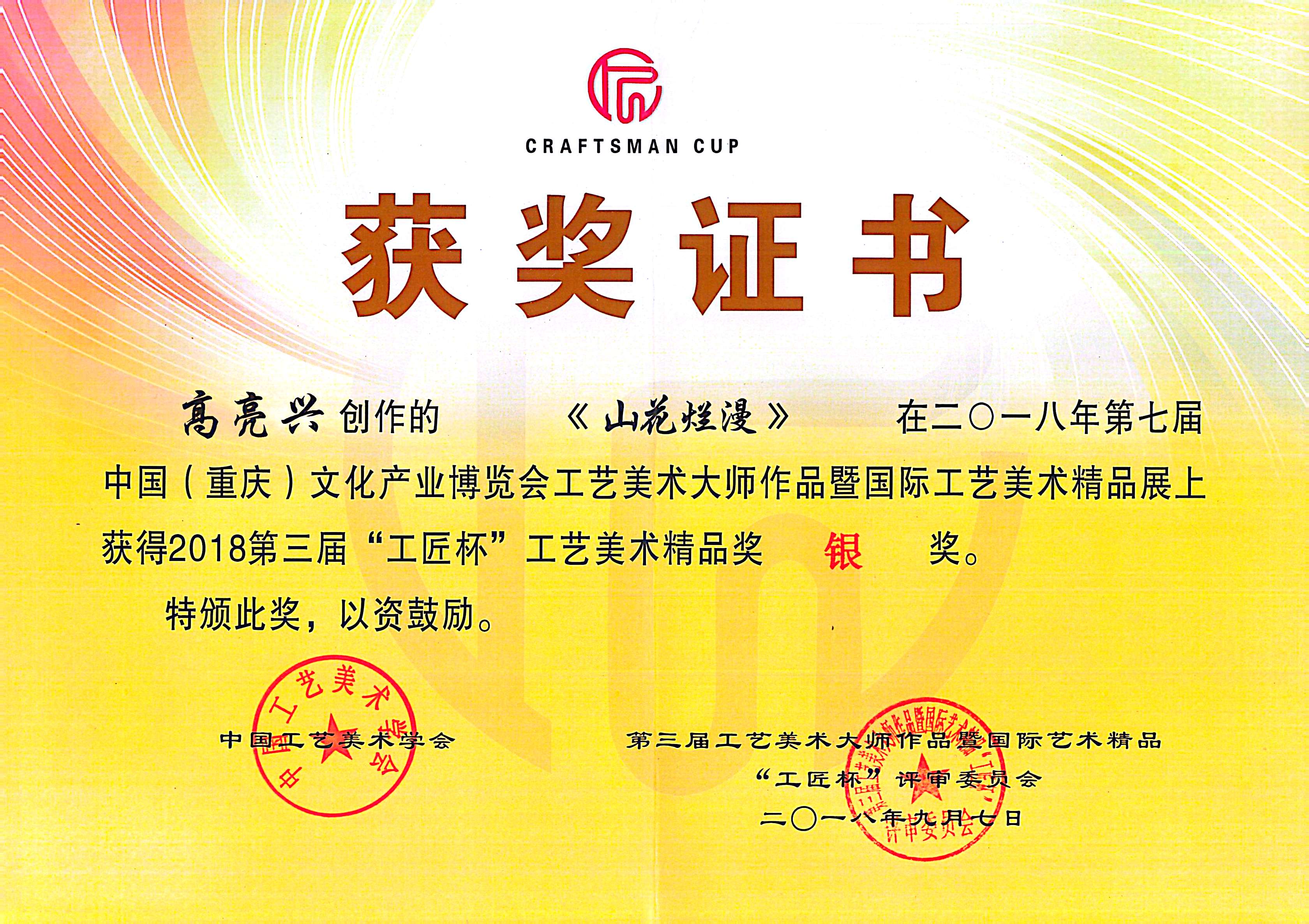 2018年获得第三届“工匠杯”工艺美术精品奖银奖,