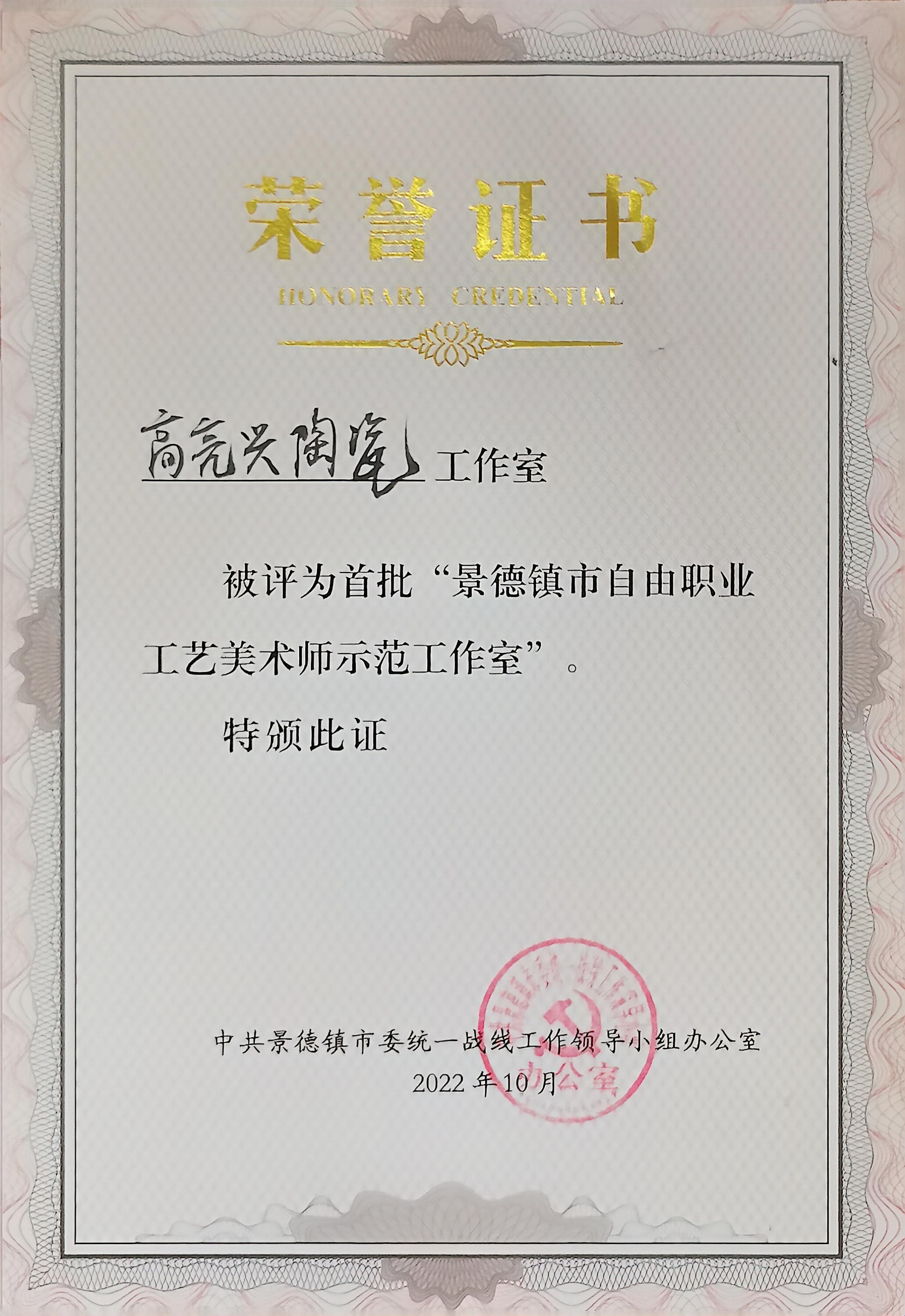 2022年高亮兴工作室被评为首批“自由职业工艺美术师示范工作室”。